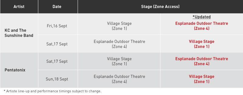 KC and The Sunshine Band will now play at Esplanade Outdoor Theatre on 16 Sep, Friday and at Village Stage on 17 Sep, Saturday.
