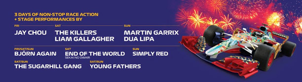Race promoter Singapore GP Pte Ltd today unveils its 2018 entertainment line-up featuring some of the hottest acts from the international music scene for the FORMULA 1 2018 SINGAPORE AIRLINES SINGAPORE GRAND PRIX. Adding to the electrifying atmosphere at the Marina Bay Street Circuit are Jay Chou, The Killers, Liam Gallagher, Martin Garrix, Dua Lipa, Simply Red, The Sugarhill Gang, Sekai No Owari, Young Fathers, Björn Again and many more throughout the race weekend this 14 to 16 September.