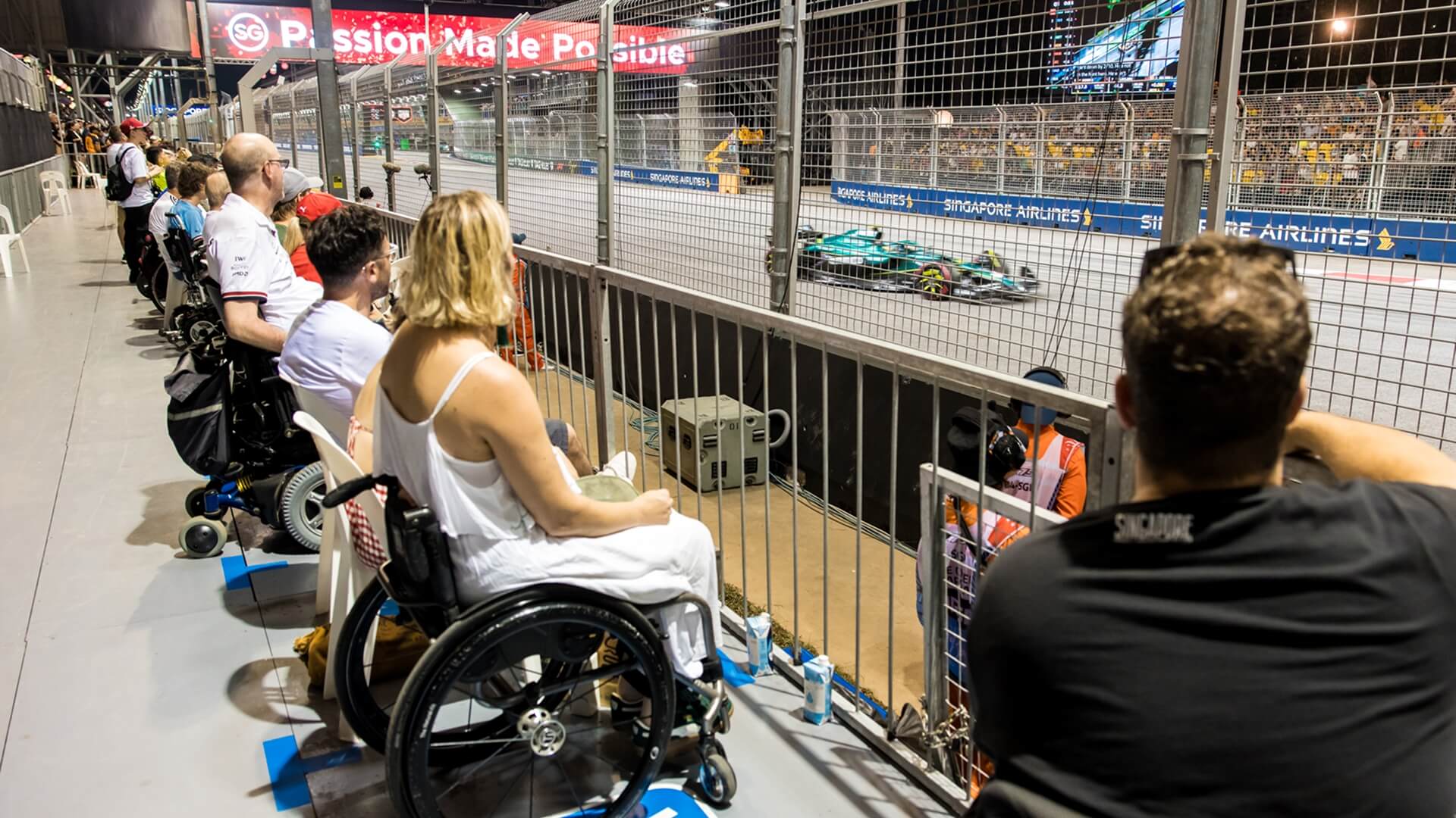 $308Strategically placed at the first turn, patrons in wheelchairs and their companions can witness intense racing action as drivers attempt to outmanoeuvre each other for the best position at Sheares (Turn 1) after decelerating from speeds of up to 290km/h from the Pit Straight.